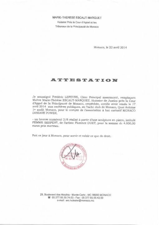 Very aware of the condition of others, she is particularly happy to donate an artwork each year to a Charity organisation. In 2014 one of her bronzes was sold at a charity auction in the presence of H.S.H. Prince Albert II of Monaco.