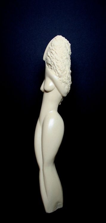 « All her works feature both the attitudes and characteristic forms of the Venuses of the Gravettian culture of the Upper Paleolithic, in particular the hypertrophy of certain anatomic parts, as well as the inspirational bold style of Constantin Brancusi with pure lines, and thin elliptical forms rather like the confident stroke of a pencil ».